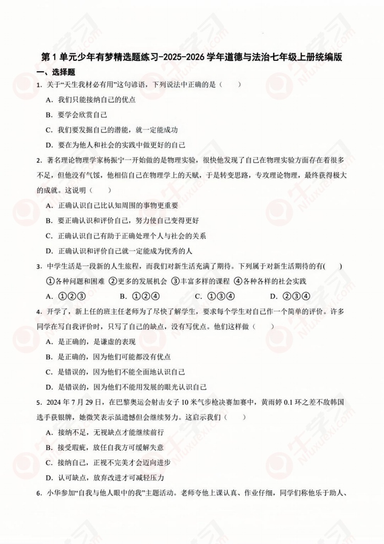 统编版2025-2026学年七年级上册道德与政治第一单元测试丨少年有梦精选_答案解析