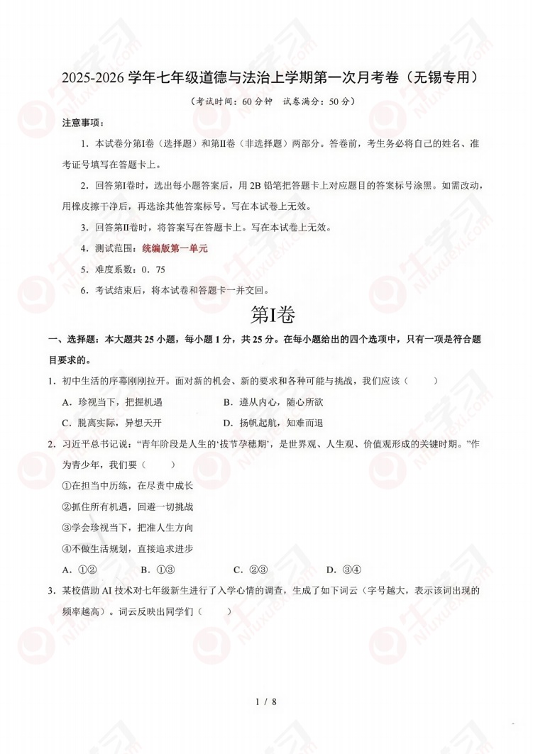 2025-2026学年无锡市七年级上册道德与法治第一次月考卷_含答案