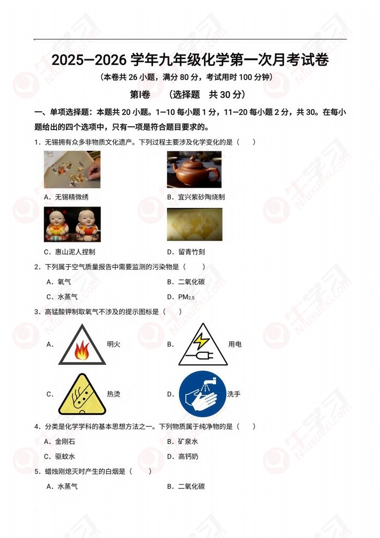 2025—2026学年苏教版九年级上册化学第一次月考试卷_原卷
