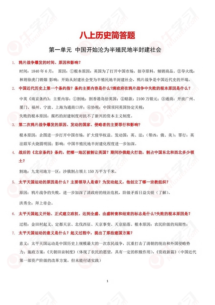 人教版八年级(初二)上册历史问答式读背提纲丨简答题