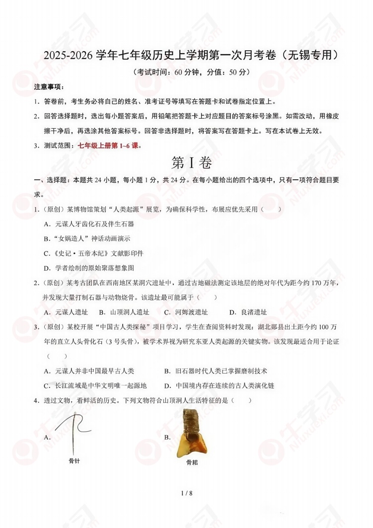 2025年无锡市初中七年级上历史第一次月考试卷含答案解析