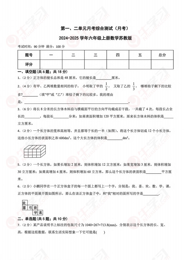 苏教版2024-2025学年六年级上册数学第一、二单元月考综合测试答案