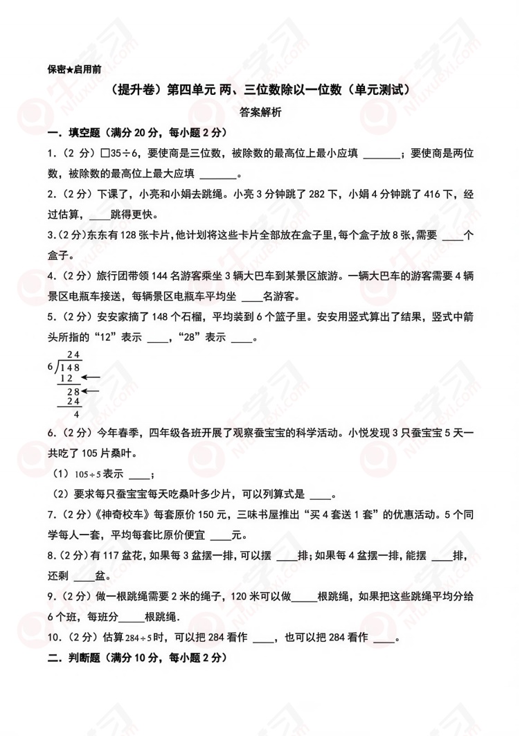 苏教版三年级数学上册第四单元测试提升卷丨两、三位数除以一位数_答案解析
