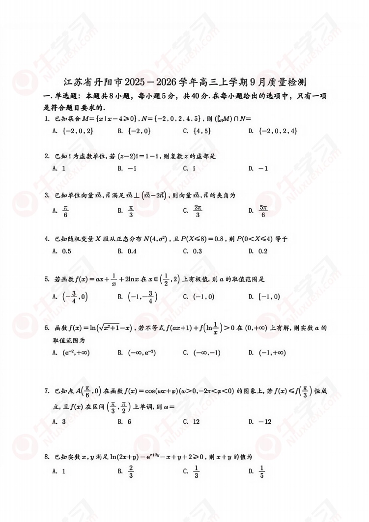 江苏省丹阳市2025-2026学年高三上学期9月质量检测月考卷_原卷