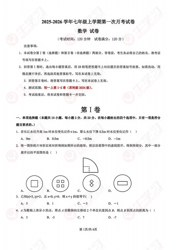 2025-2026学年七年级上学期数学第一次月考模拟卷_答案解析