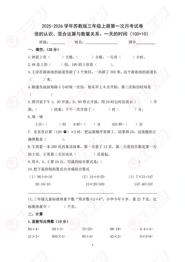 2025-2026学年苏教版三年级上册数学第一次月考试卷_含答案