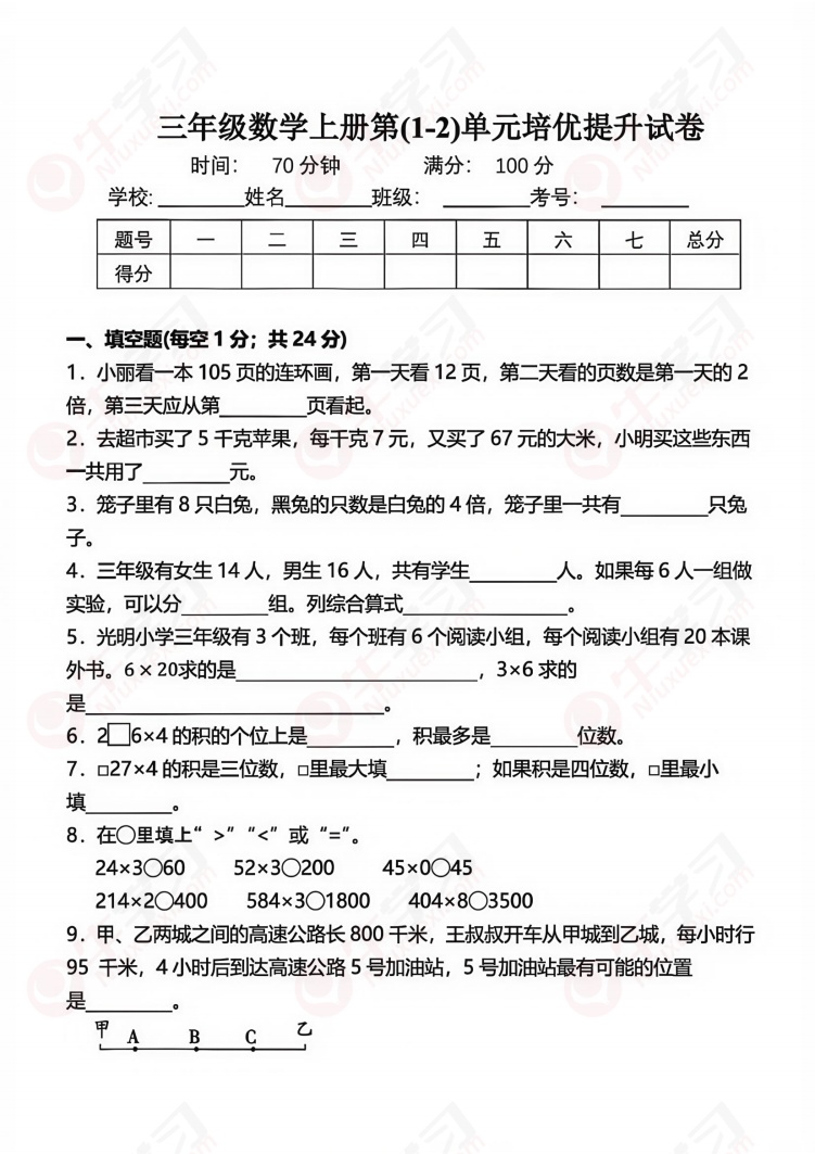 苏教版三年级上册数学第(1-2)单元培优提升试卷_含答案