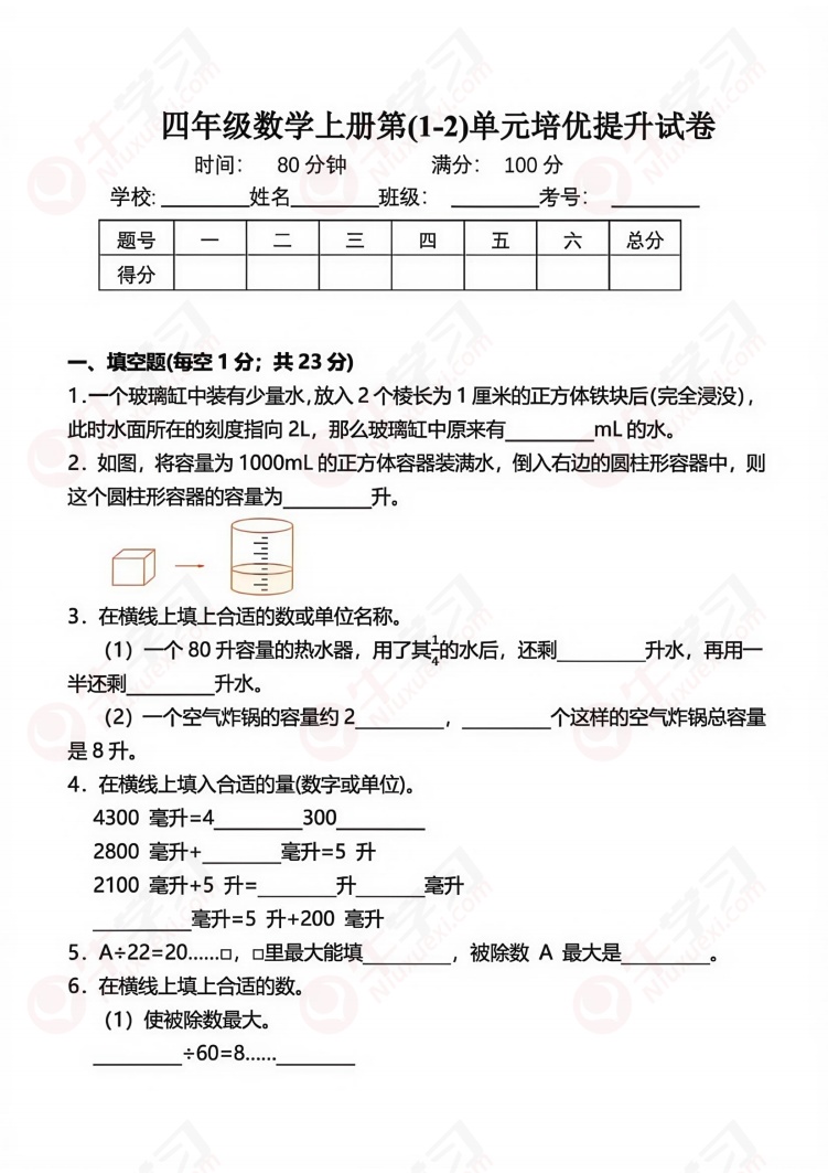 苏教版四年级上册数学第(1-2)单元培优提升试卷_含答案