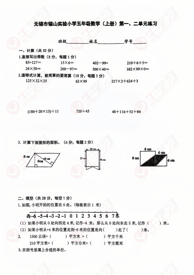 苏教版无锡市锡山区实验小学五年级上学期数学月考_答案