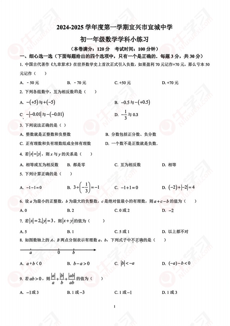 2024-2025学年度宜兴市宜城中学七年级上学期第一次月考数学试题_含部分答案解析