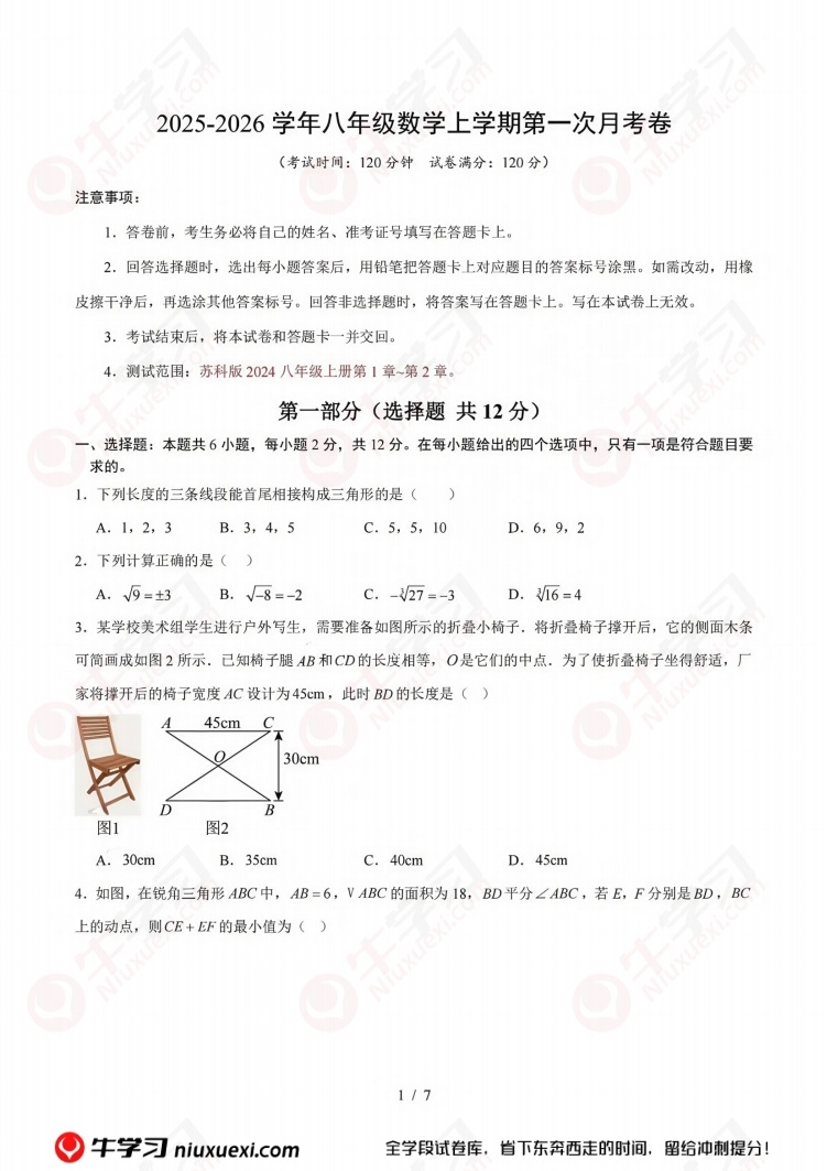 苏教版2025-2026学年八年级数学上学期第一次月考试卷_含答案解析
