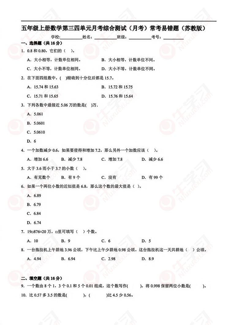 苏教版五年级上册数学第三-四单元月考综合测试卷丨常考易错题_含参考答案