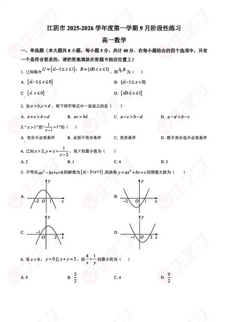 苏教版江阴市2025-2026学年高一数学上学期9月月考_原卷