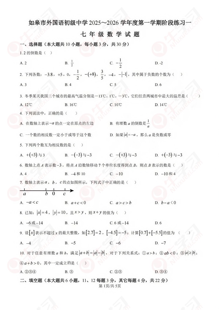 苏教版如皋市外国语2025-2026学年七年级上册数学阶段月考卷_原卷
