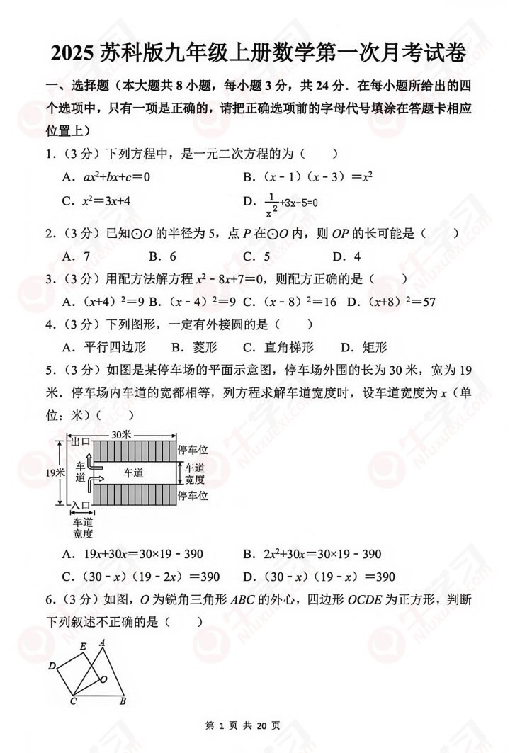 苏科版2025九年级数学初三上册第一次月考试卷_含答案解析