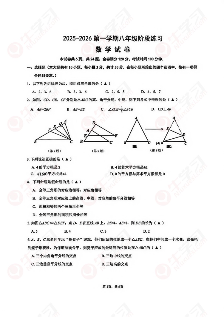 2025-2026镇江市经开区八年级上册数学试卷阶段性练习卷_原卷版+答题卡