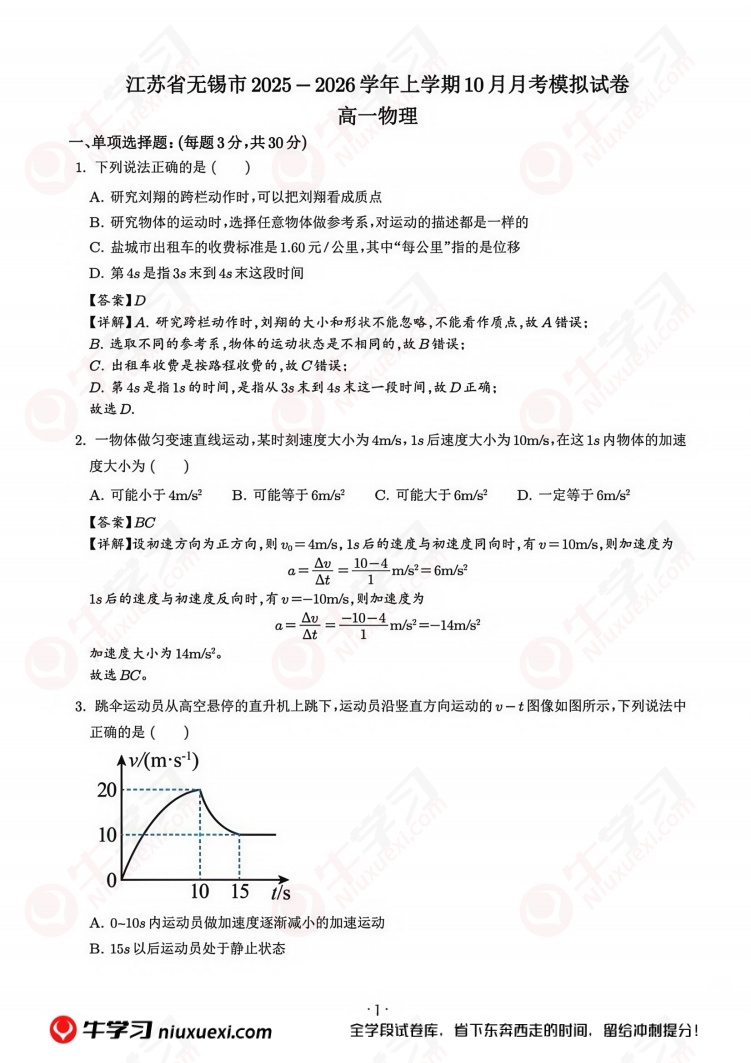 江苏无锡市2025-2026学年高一上学期物理10月月考模拟试卷_含答案解析