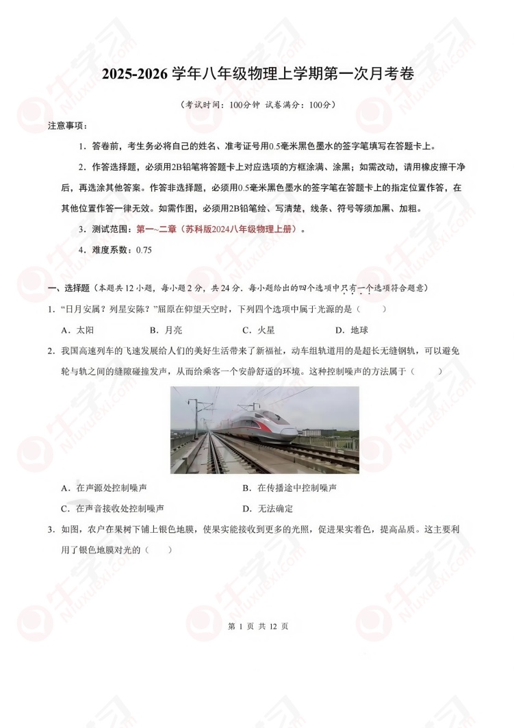 2025-2026学年八年级物理上学期第一次月考试卷_含参考答案