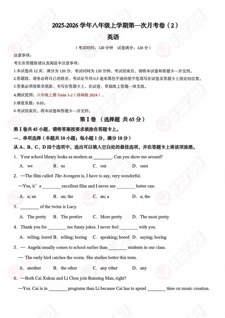 苏教版新译林英语八年级上册第一次月考卷Unit1-2_含答案