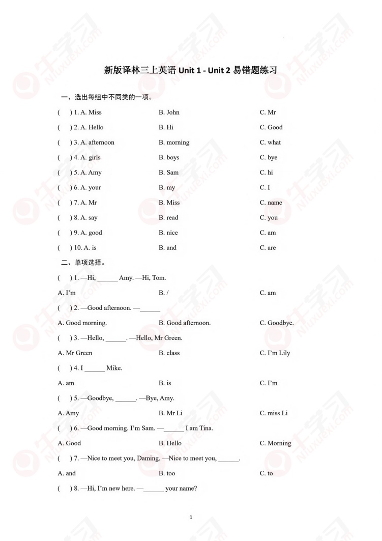 苏教版新译林英语三年级上册Unit 1-Unit 2月考易错