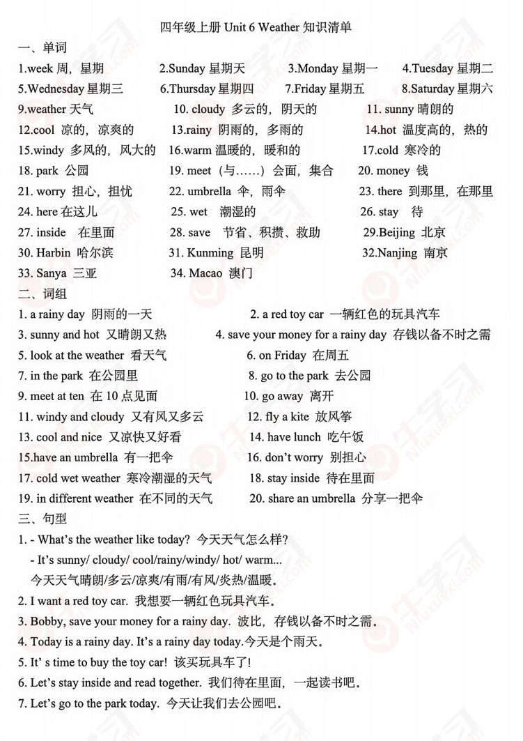 苏教版四年级上册新译林英语Unit6知识清单