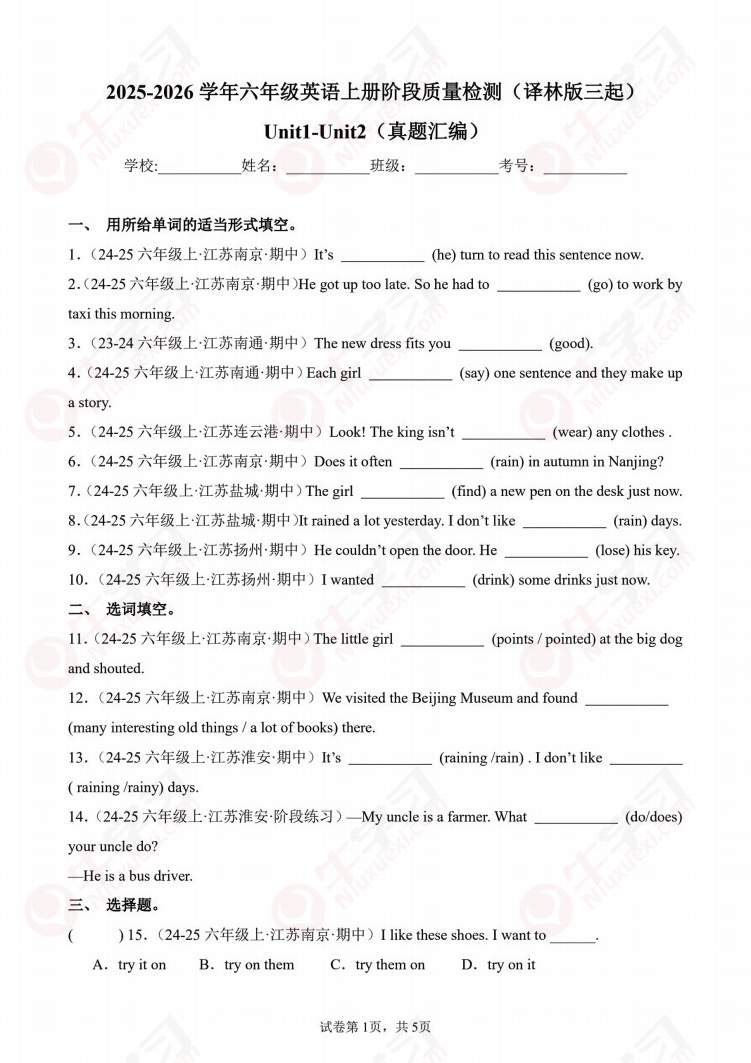 苏教版2025-2026学年六年级上册阶段质量检测丨英语Unit1-Unit2(真题汇编)含答案