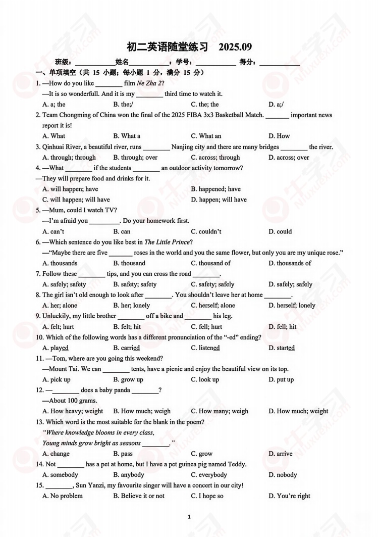 2025年南京市八上英语第一次月考真题含答案