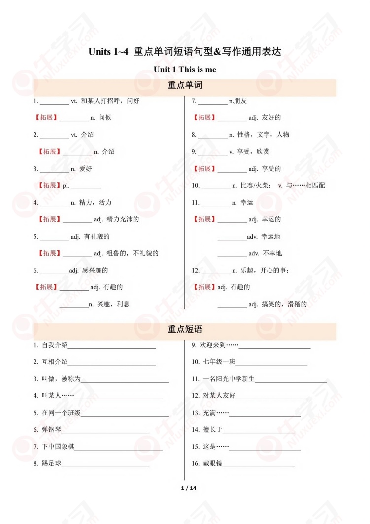 苏教译林版初一上册七年级7AUnits 1~4 重点单词短语句型&写作_答案版