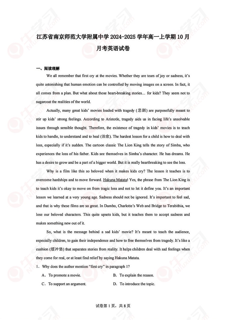 江苏译林版南师附中高一上学期10月英语月考卷_原卷