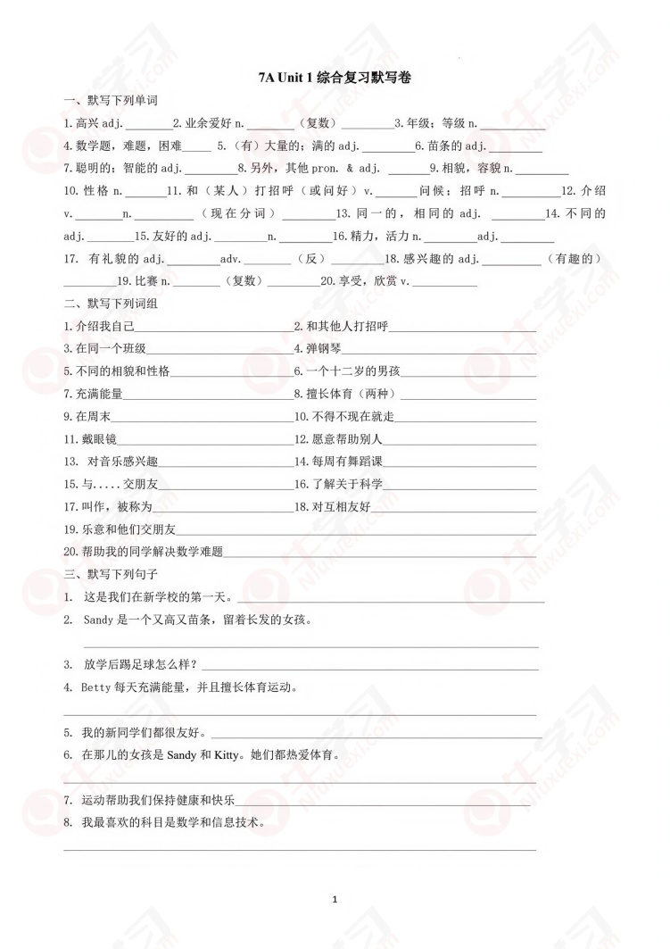 新译林英语七年级上册Units1-4综合复习默写含答案