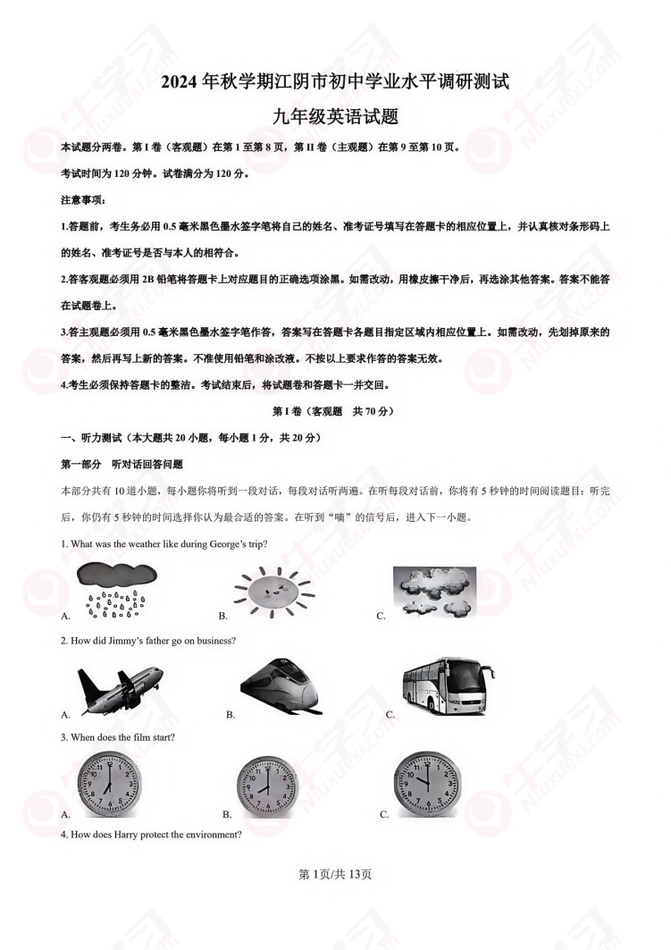 2024年秋学期江阴市九年级上学期英语期中考试卷_原卷版
