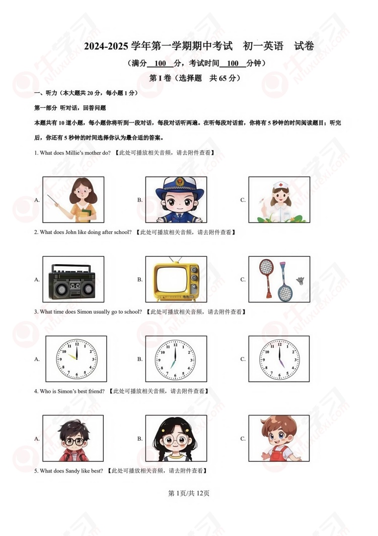 2024-2025学年江阴市直属片区七年级英语上学期期中考试卷_原卷版