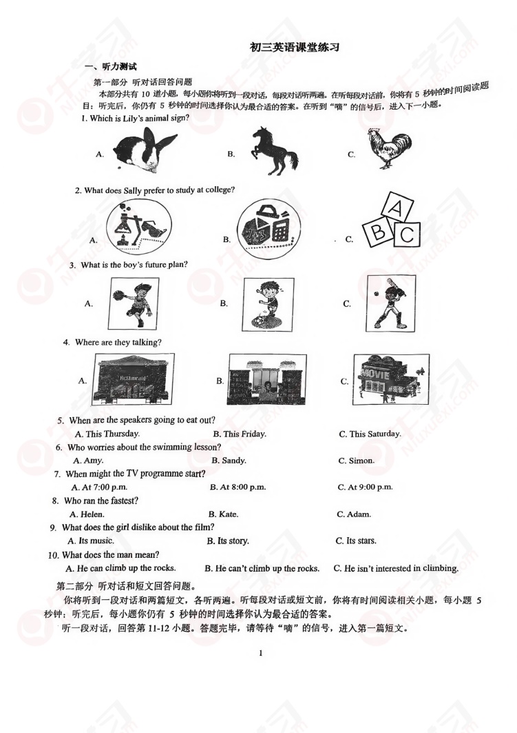无锡江阴市南菁中学初三上册英语10月份月考卷_原卷版