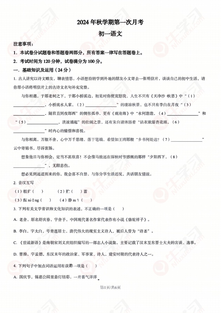 2024年秋学期无锡市天一实验学校七年级上册语文第一次月考卷_原卷